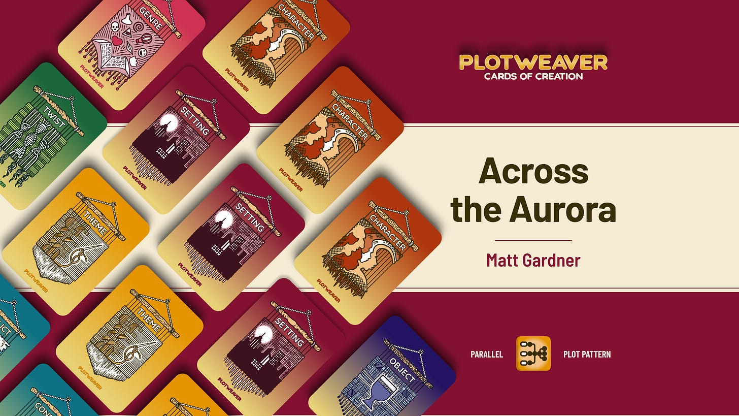 This story uses a Parallel Plot Pattern, written in 15-minute timed acts with all story cards drawn at random. For more information, visit www.plotweavergame.com