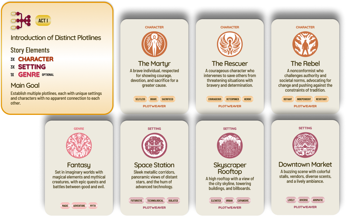 (Story Element Cards: The Martyr, Space Station, The Rescuer, Skyscraper Rooftop, The Rebel, Downtown Market, and Fantasy)