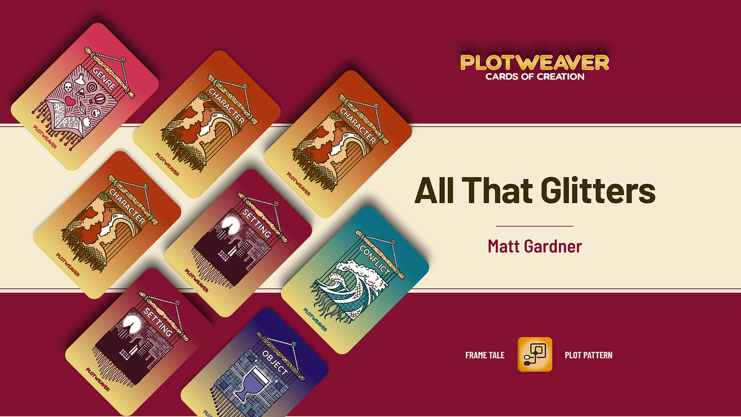 This story uses a Frame Tale Plot Pattern, written in 10-minute timed acts with all story cards drawn at random. For more information, visit www.plotweavergame.com