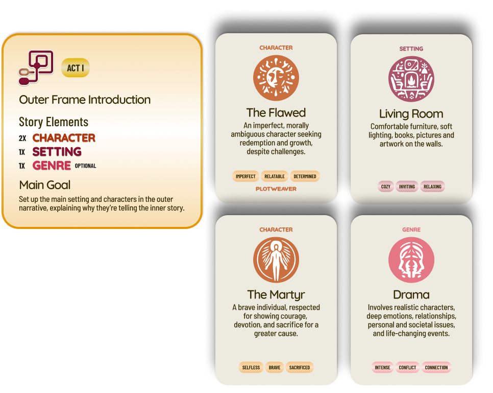 (Story Element Cards: The Flawed, The Martyr, Living Room, and Drama)