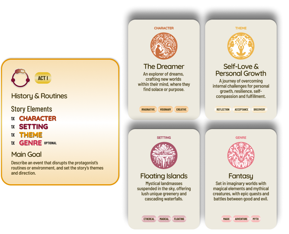 Story Element Cards: The Dreamer, Floating Islands, Self-Love & Personal Growth, and Fantasy