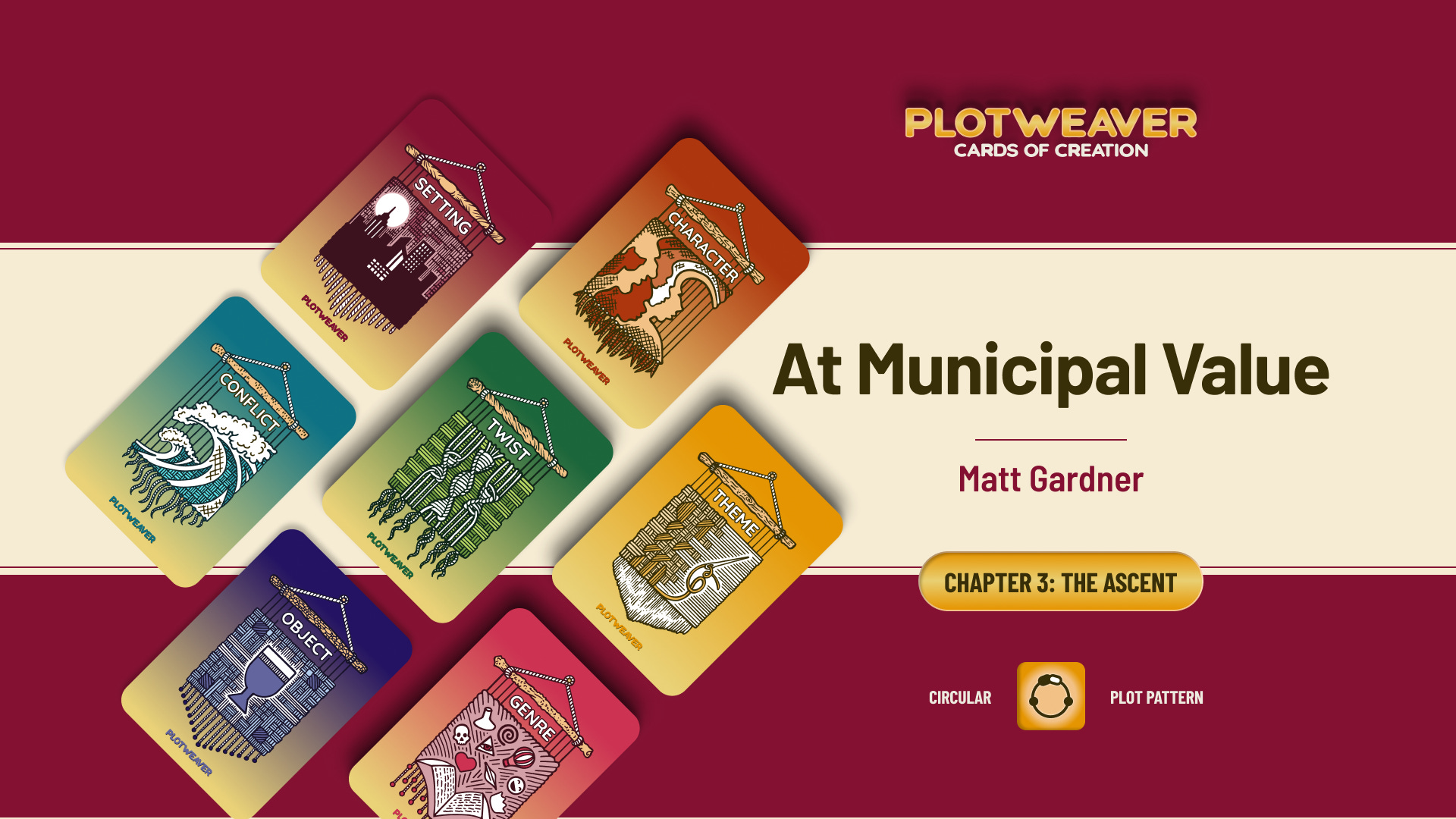 This story uses a Circular Plot Pattern, written in 20-minute timed acts with all story cards drawn at random. For more information, visit www.plotweavergame.com