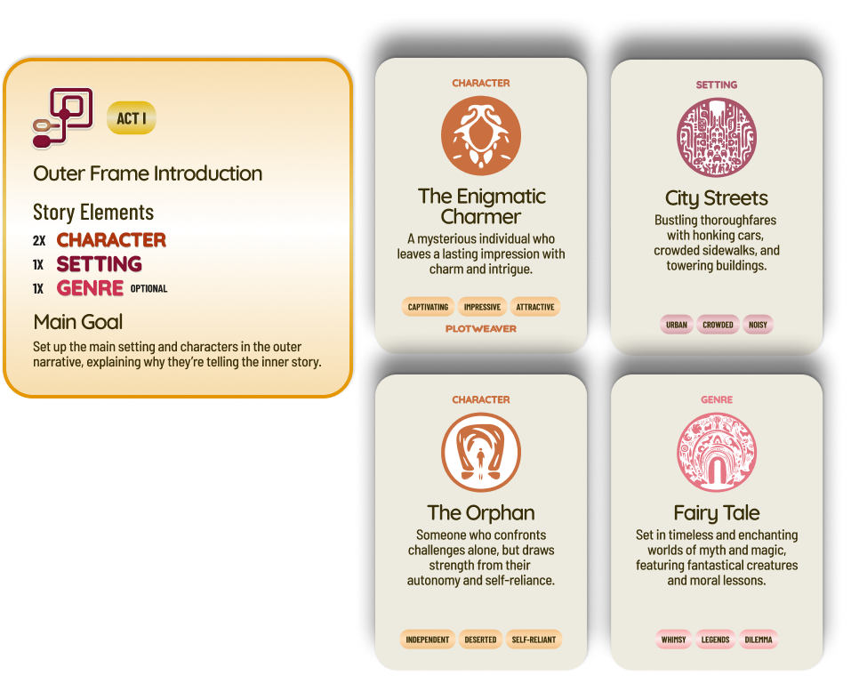 (Story Element Cards: The Enigmatic Charmer, The Orphan, City Streets, and Fairy Tale)