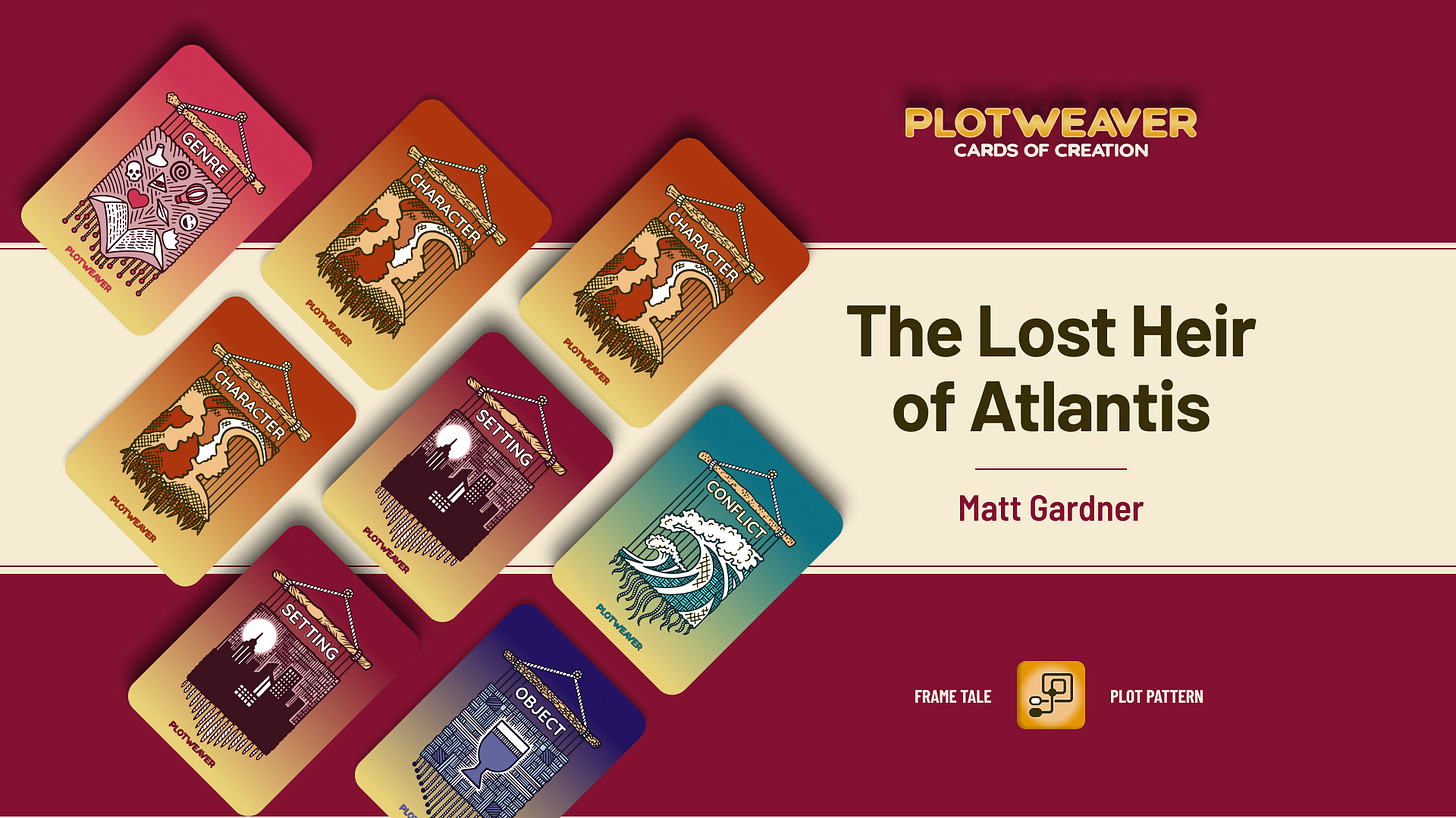 This story uses a Frame Tale Plot Pattern, written in 15-minute timed acts with all story cards drawn at random. For more information, visit www.plotweavergame.com