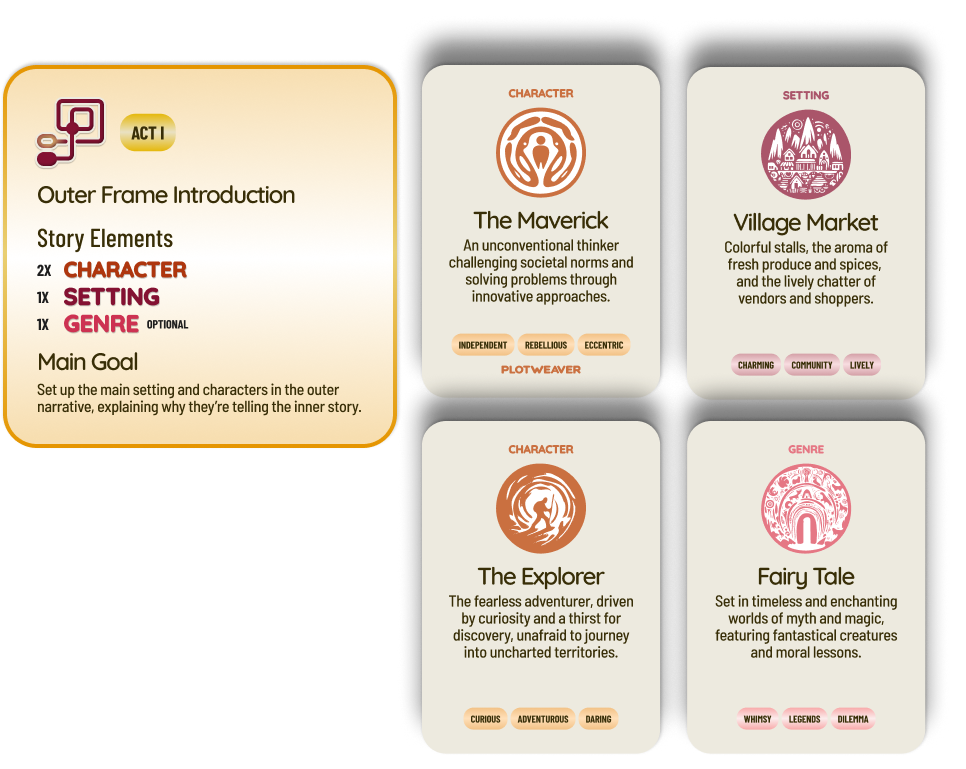 (Story Element Cards: The Maverick, The Explorer, Village Market, and Fairy Tale)