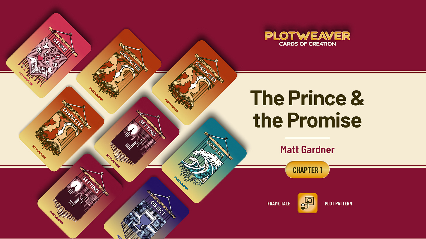 This story uses a Frame Tale Plot Pattern, written in 15-minute timed acts with all story cards drawn at random. For more information, visit www.plotweavergame.com