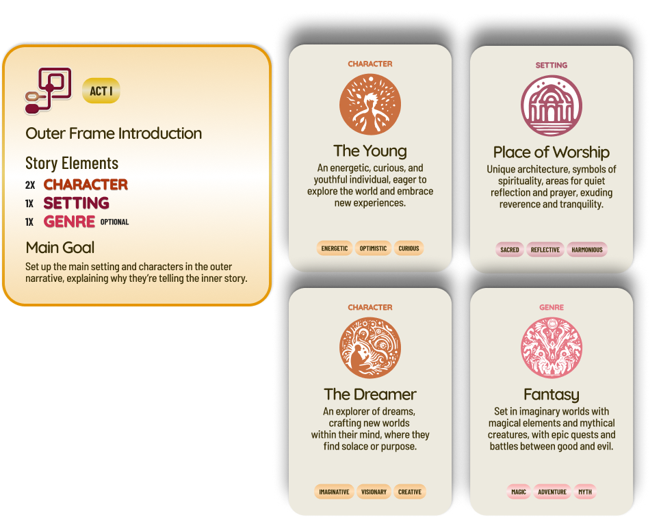 Story Element Cards: The Young, The Dreamer, Place of Worship, and Fantasy